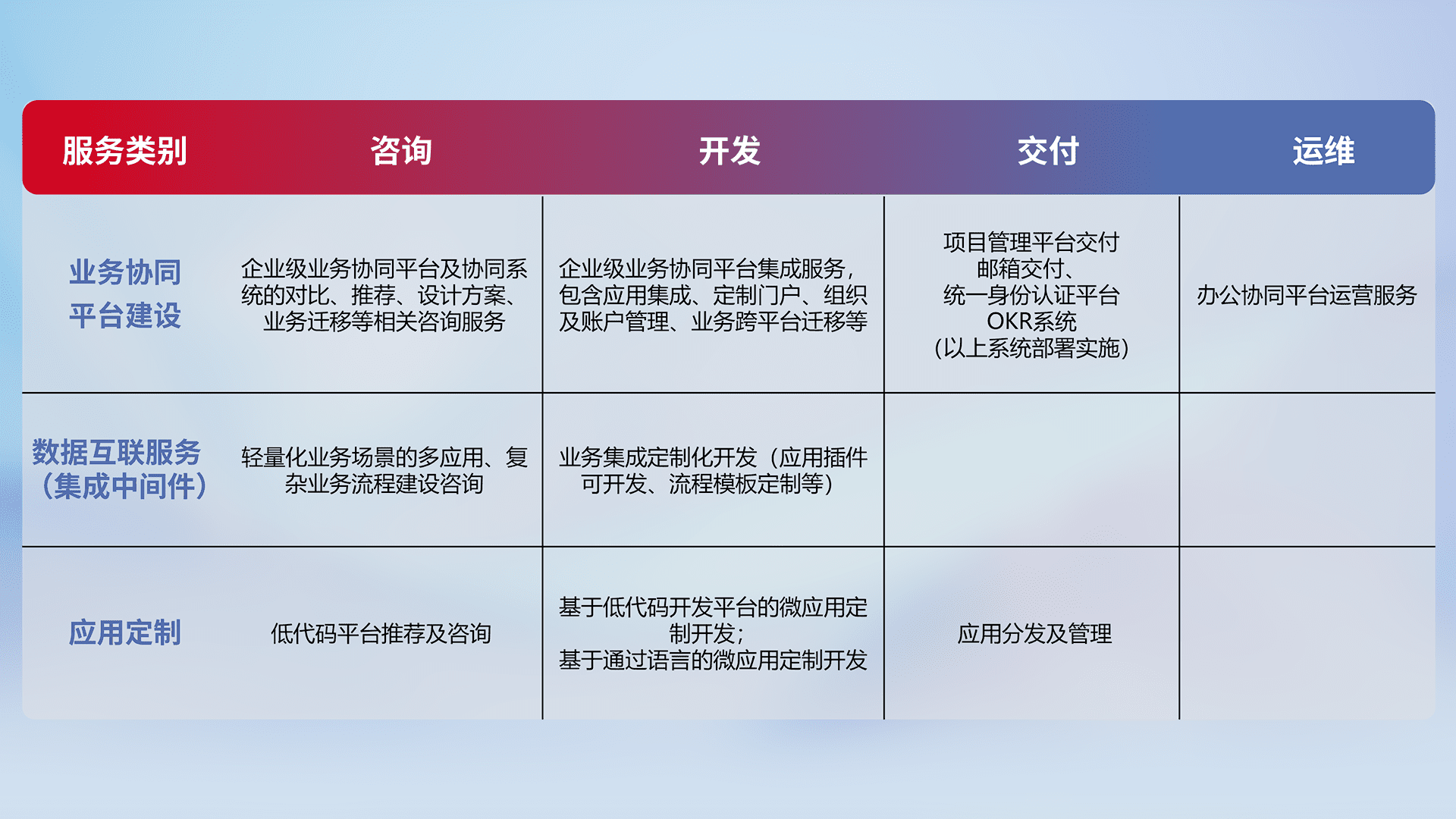 针对钉钉、、、、企微、、IDaas等平台级产品提供产品的规划、、、、方案、、、、交付、、、定制化开发等服务,,,,实现如统一协同办公、、、智能客户服务、、、混合会议管理、、智能数据查询、、等业务场景,,,实现数字化转型。。。